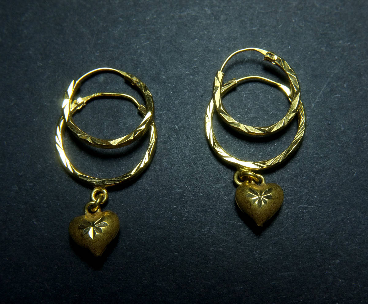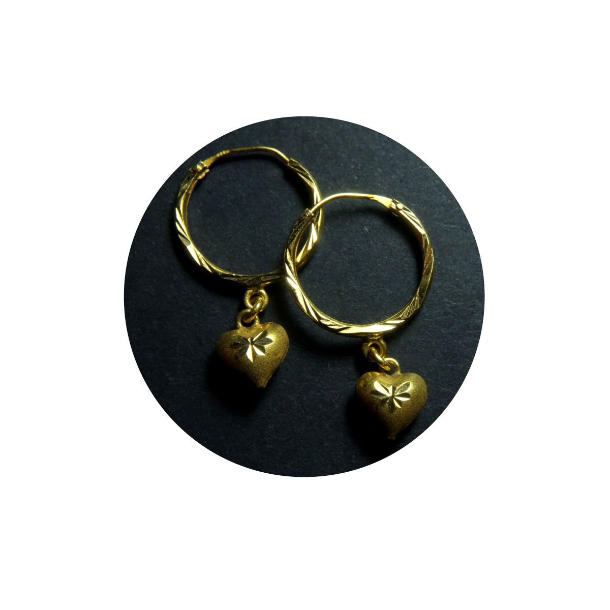 22k Chinese Heart Drop Hoop Earrings, 13mm